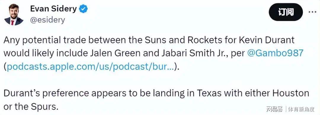 Gambadoro进一步透露,在太阳队与火箭队之间关于杜兰特的任何潜在交易中,杰伦·格林与小贾巴里·史密斯均有可能成为交易的一部分。而杜兰特本人,则似乎更倾向于加盟马刺队。